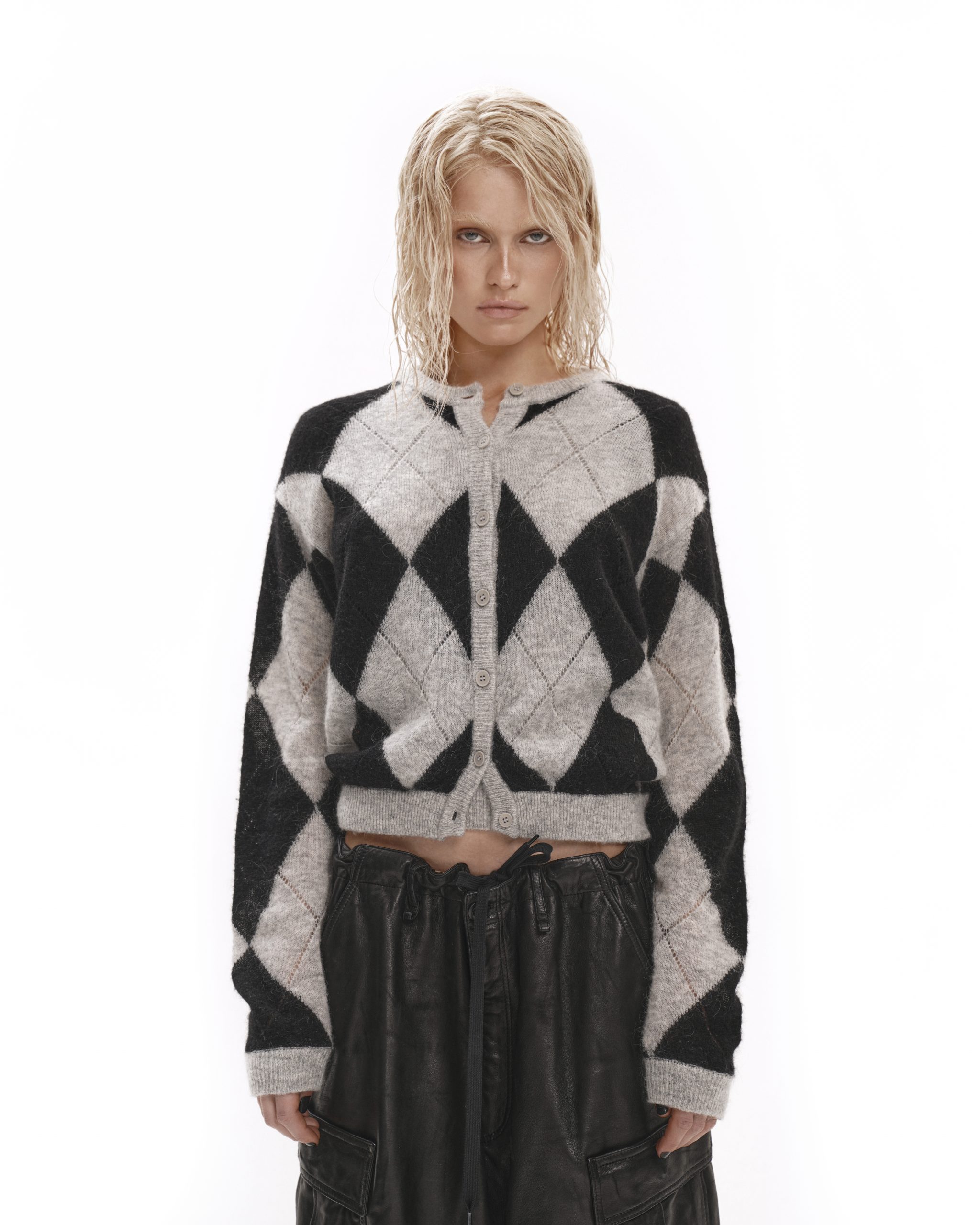 Кардиган из мягкой фактурной пряжи с крупным графичным узором, выполнили из натуральной шерсти с добавлением мохера. Модель с круглым вырезом и застежкой на пуговицы, комфортна в носке и универсальна в сочетаниях. Изделие с крупным ромбовым узором легко впишется в базовый гардероб, подойдет для многослойных образов и добавит структуру за счет контрастного рисунка