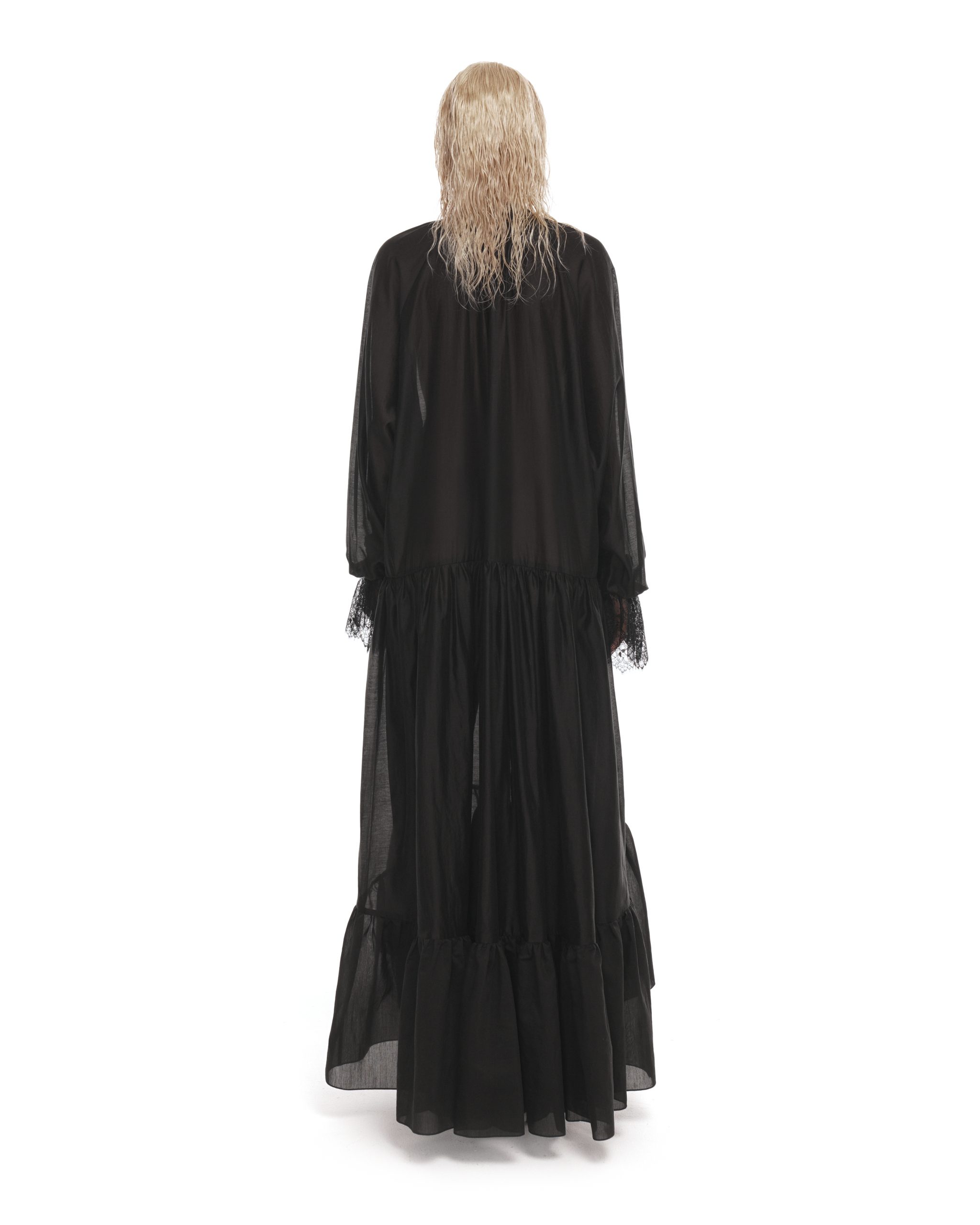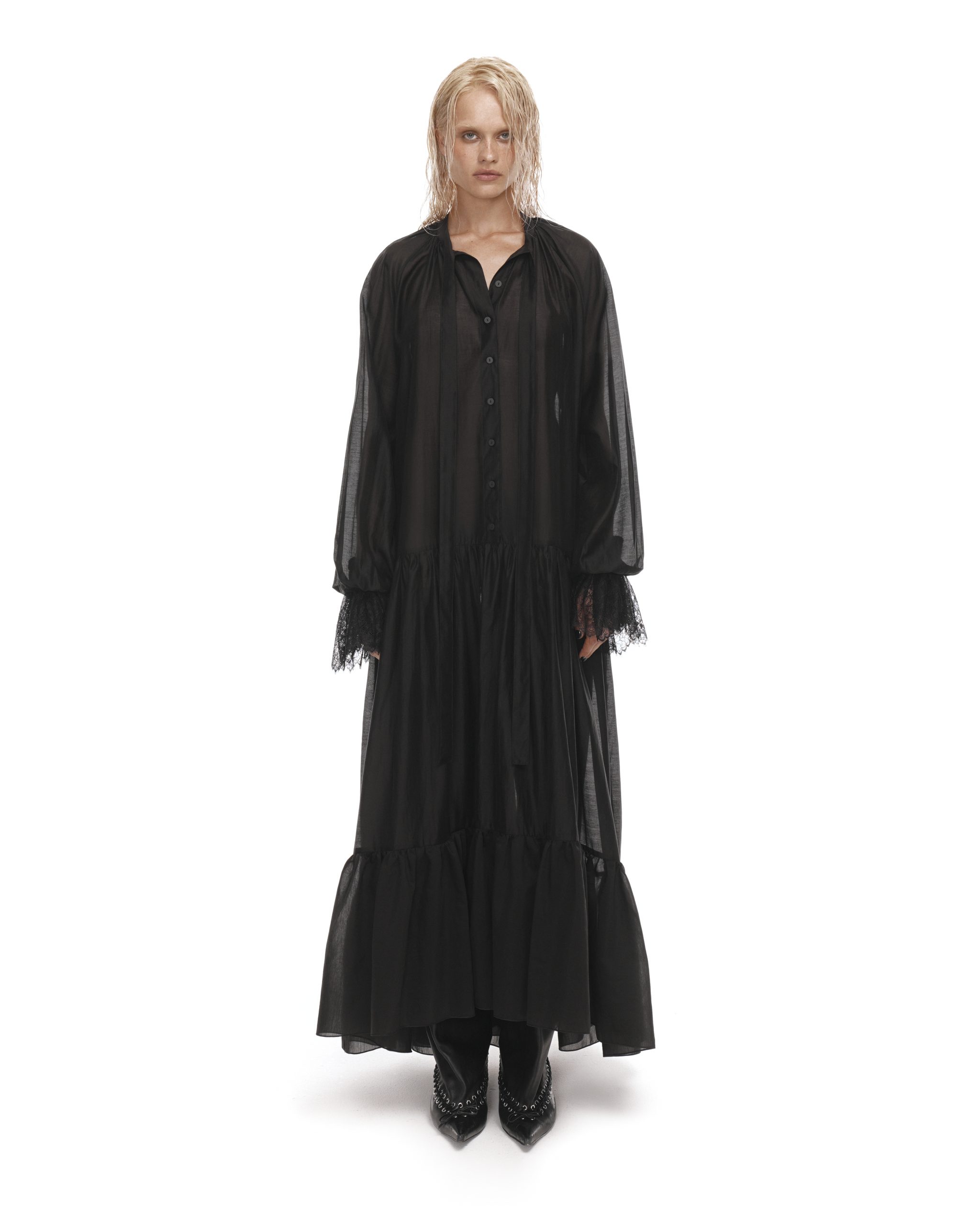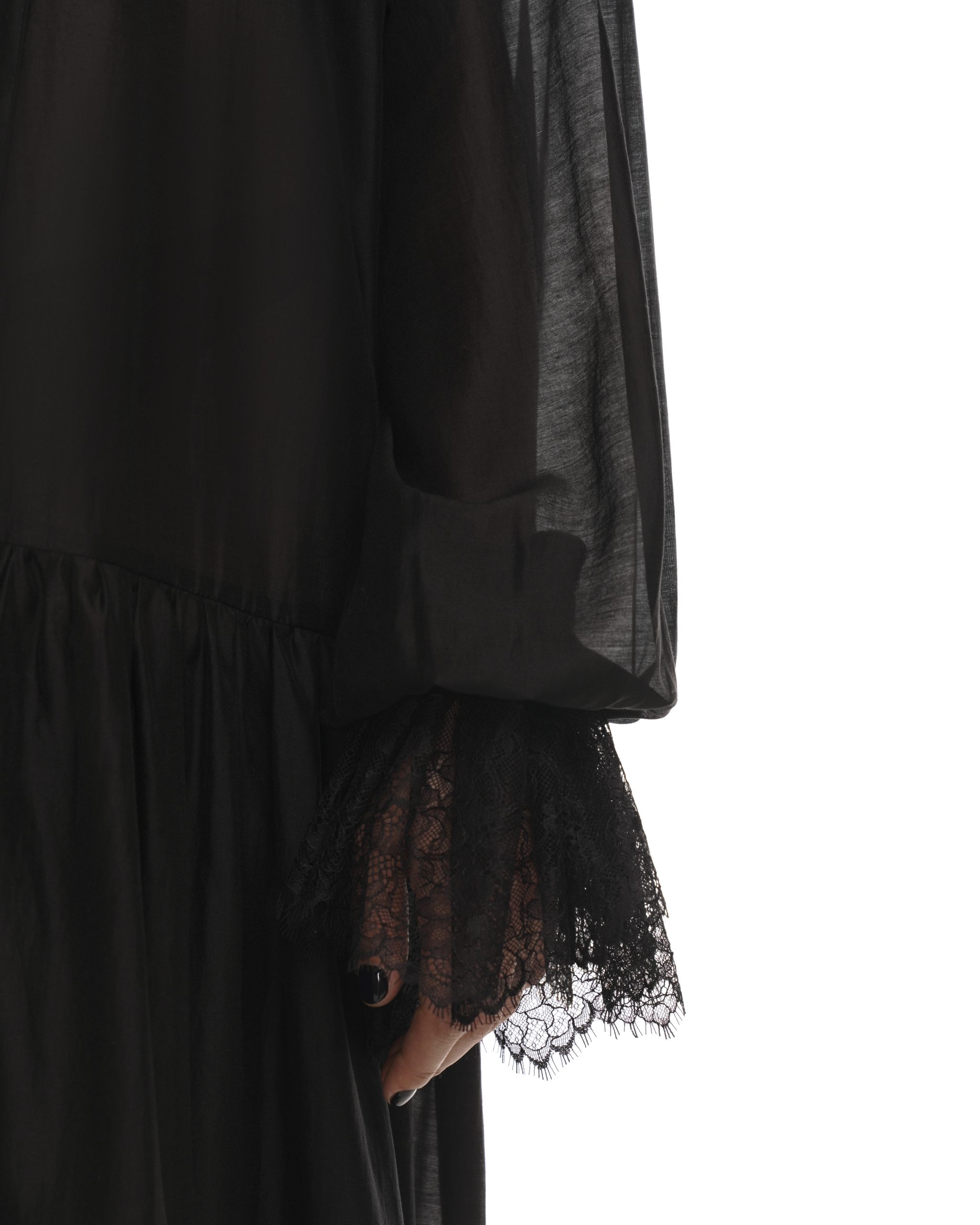 Воздушное платье свободного кроя с драматичными акцентами, выполнили из мягкой, тактильной ткани, создающий воздушный силуэт. Свободный ассиметричный крой обеспечивает комфорт и изящество в движении, а объемные рукава и кружевные манжеты добавят образу чувственность. Наши стилисты рекомендуют носить платье с джинсами или ботфортами.
