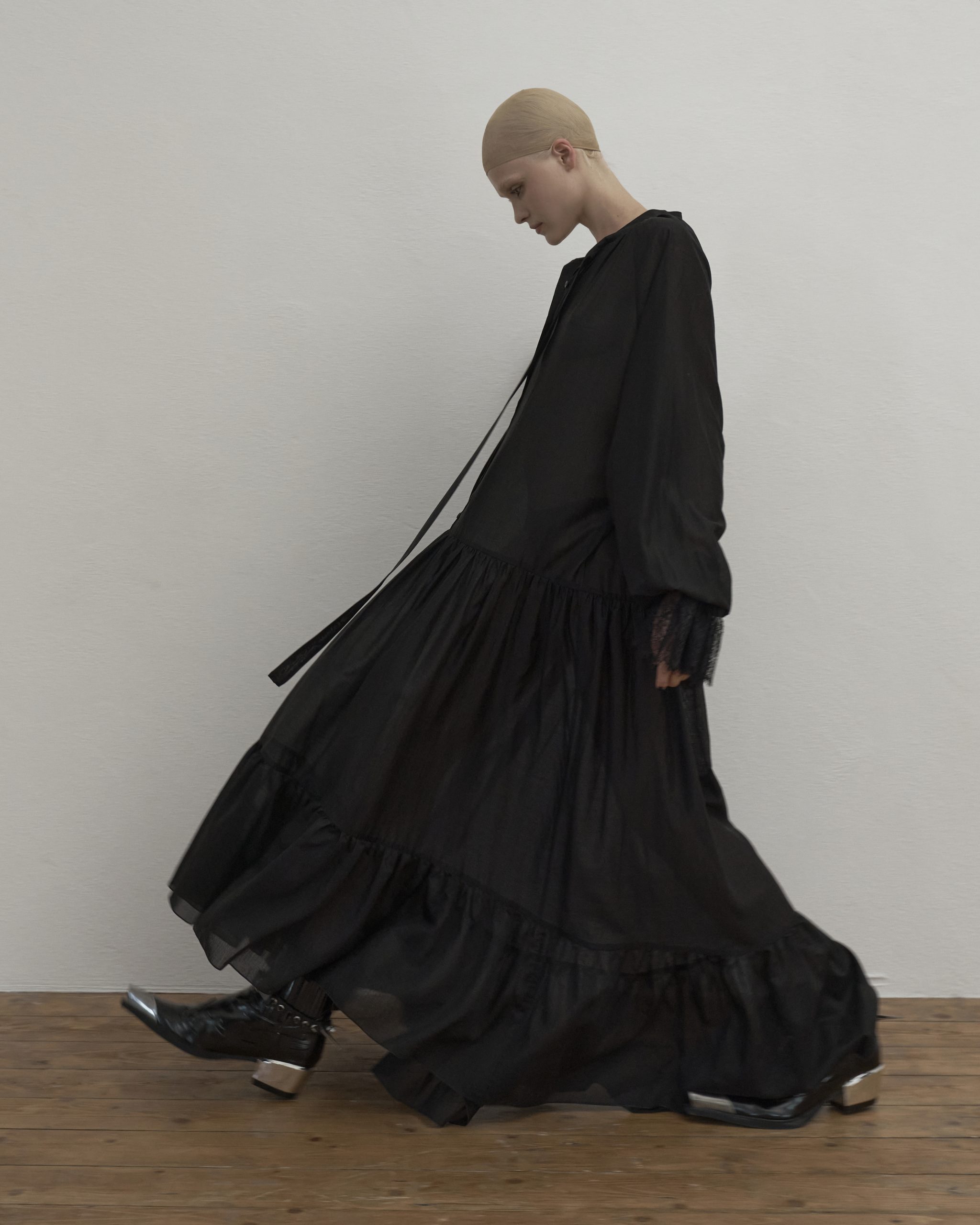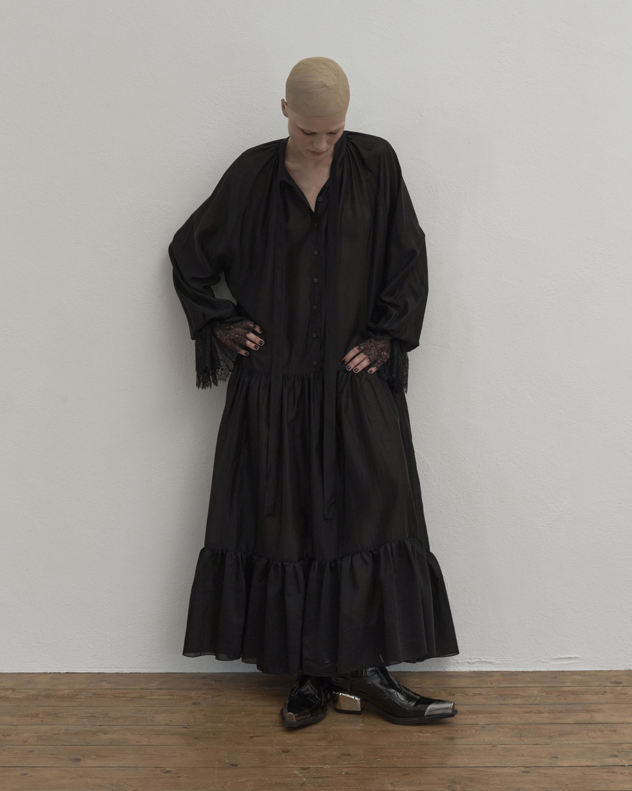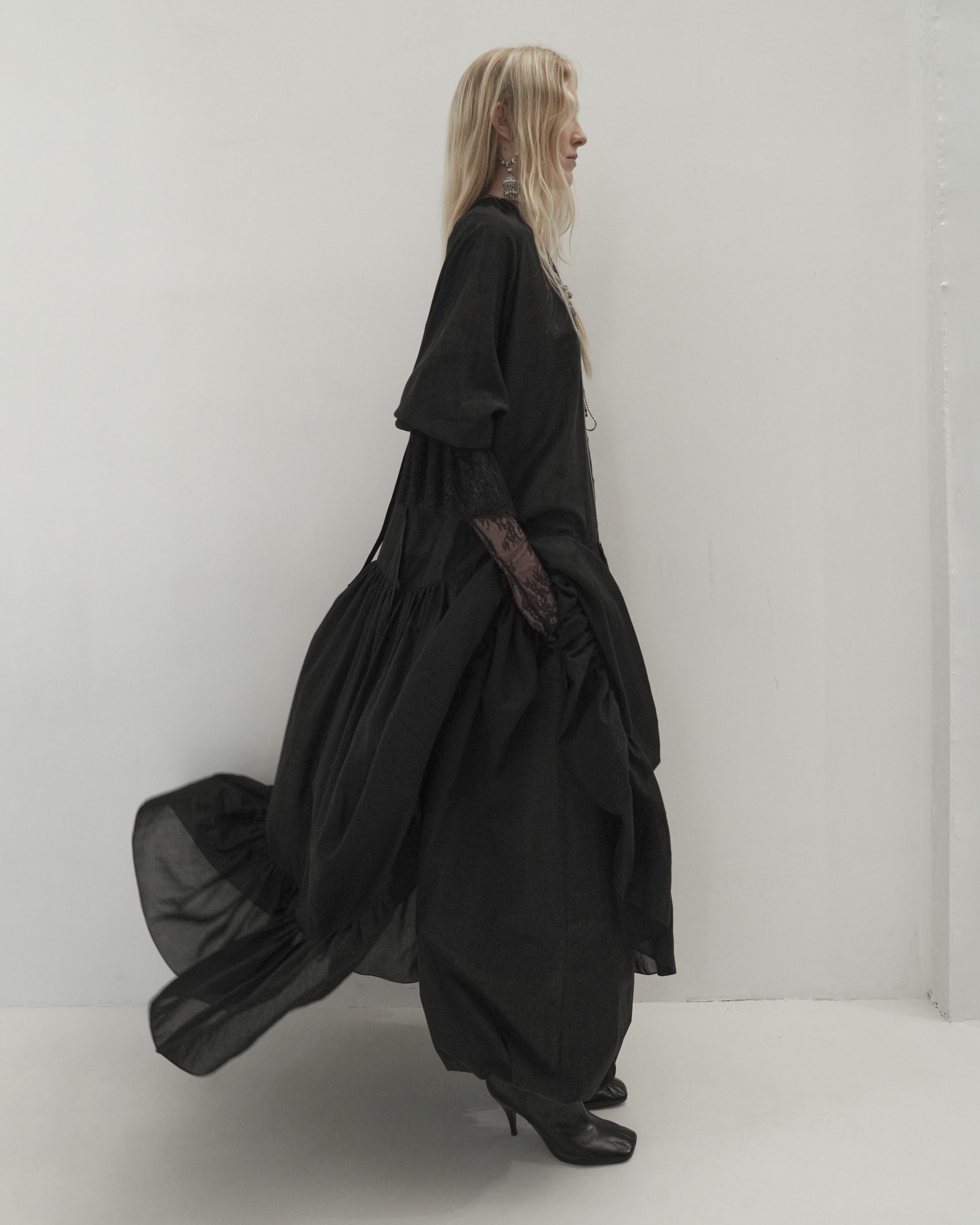 Воздушное платье свободного кроя с драматичными акцентами, выполнили из мягкой, тактильной ткани, создающий воздушный силуэт. Свободный ассиметричный крой обеспечивает комфорт и изящество в движении, а объемные рукава и кружевные манжеты добавят образу чувственность. Наши стилисты рекомендуют носить платье с джинсами или ботфортами.