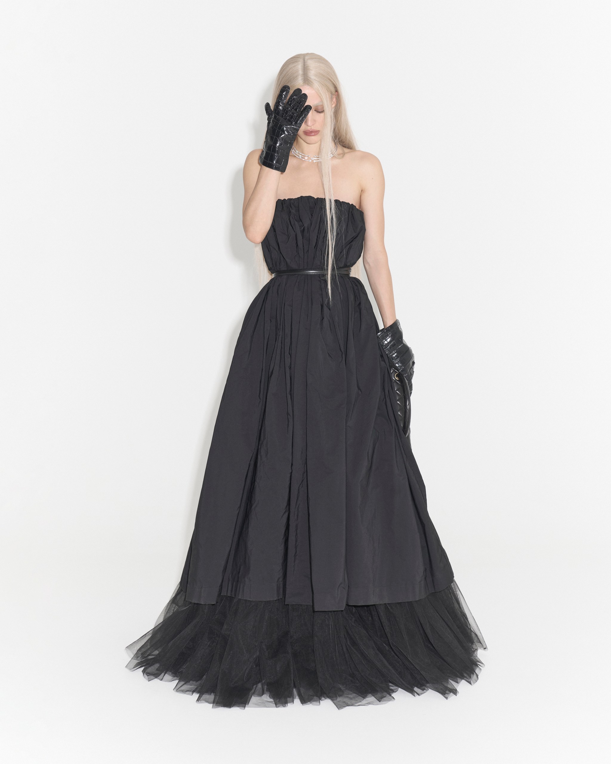 Пышный сет из двух акцентных юбок, собрали в единый силуэт, который формирует роскошную многослойную конструкцию. Верхнюю часть — юбку макси глубокого черного цвета выполнили из тафты. Материал свободно драпируется, создавая мягкие текучие складки, тогда как широкий и эластичный пояс подчеркивает талию, задавая силуэт. Нижнюю многоярусную воздушную юбку выполнили из фатина. Изделие дополнили мягким подкладом из хлопка, а пояс на резинке легко прикрепляется к верхней юбке, благодаря конструкции из пуговиц. Этот умопомрачительный сет создан для истинных ценителей прекрасного. Он же является и трансформером — позволяет носить обе конструкции самостоятельно, как в повседневных образах, так и в вечерних концепциях.