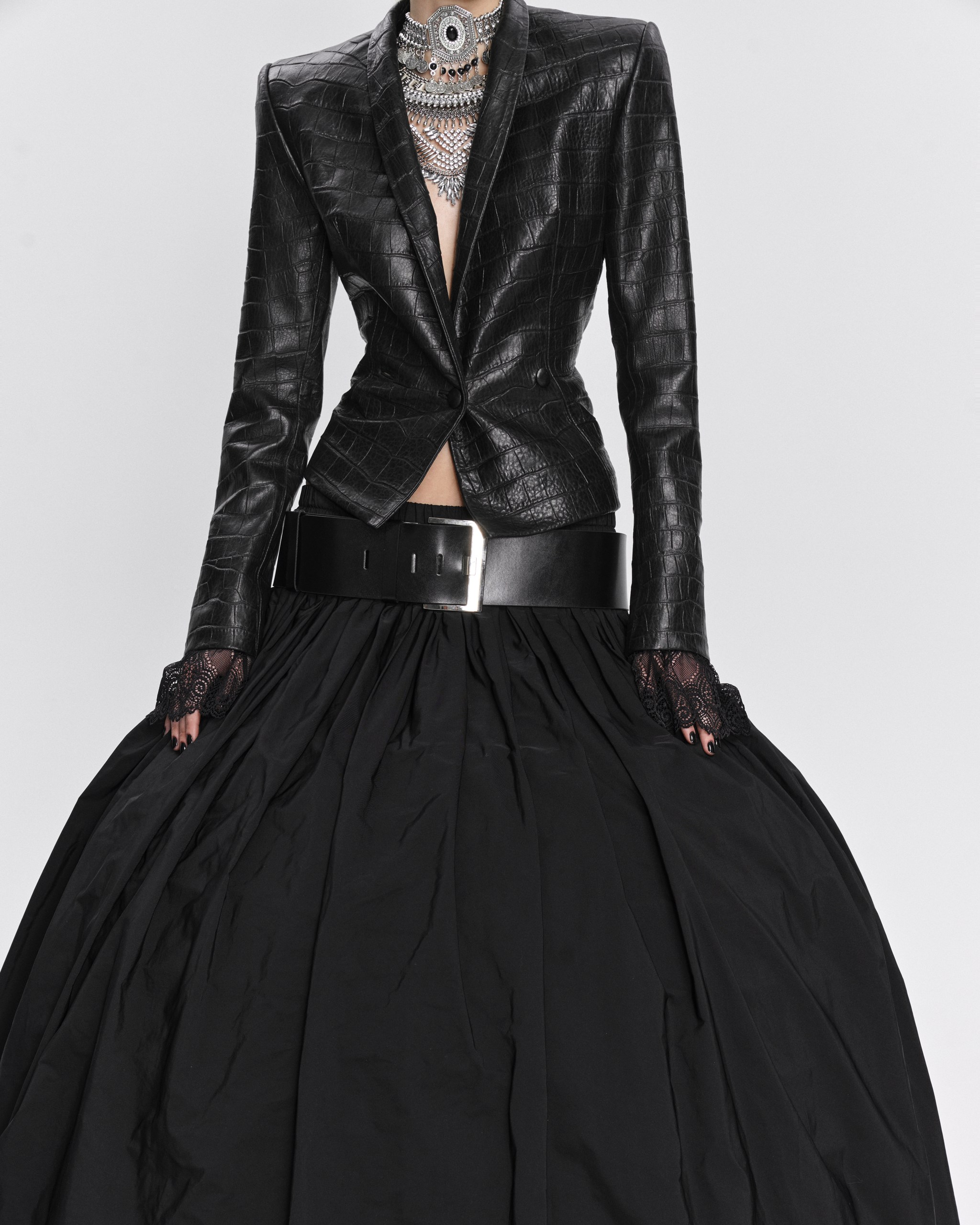Культовым изделием новогодней капсулы является приталенный жакет, выполненный из высококачественной овечьей кожи, с изысканной имитацией тиснения кроко. Скульптурная линия плеч и точная посадка создают эффект архитектурного кроя, подчеркивая талию и демонстрируют изящный силуэт. Двубортная застежка и аккуратный воротник придают модели лаконичность и премиальный характер. Жакет становится ключевым элементом гардероба, который легко трансформируется под разные стилистические сценарии, — от современной элегантности, до выразительного драматичного стиля.