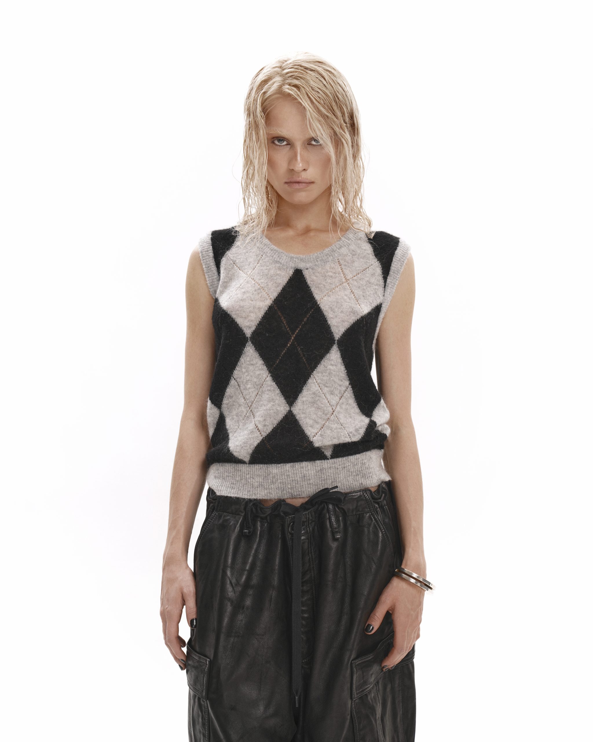Теплый шерстяной жилет с ромбовым узором, выполнили из мягкой, пушистой пряжи, которая создает тактильное ощущение уюта. Контраст серого и глубокого черного делает модель выразительной, а равномерная посадка позволяет изделию комфортно лежать по фигуре, легко сочетаться с брюками или джинсами. Создавайте многослойные образы с базовыми лонгами или монотонными рубашками, носите вместе с нашим кардиганом в идентичной палитре